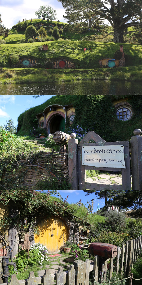 Nous avons vu les portes rondes des trous de Hobbits et même la maison de Bilbon et de Frodon Saquet. Bilbon Saquet est le personnage principal du Hobbit 1, 2 et 3. Nous avons vu la place des fêtes où s'est passé l'anniversaire de Bilbon Saquet.