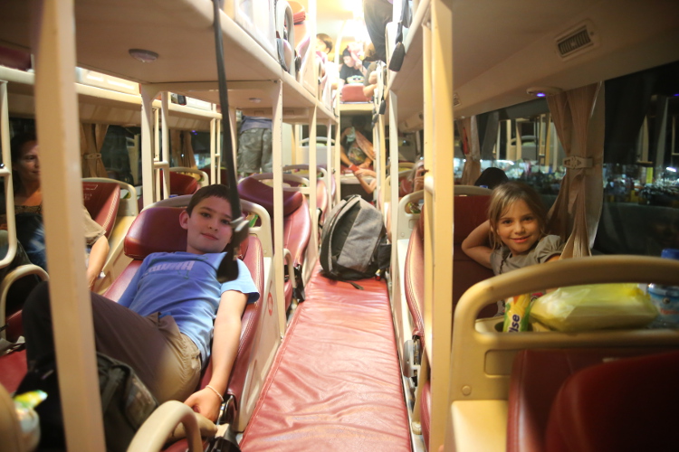Pas de train au Laos (seulement quelques km de la frontière thaïlandaise à Vientiane) alors nous découvrons le sleeping bus : 2 étages de sièges inclinés sur 3 rangées ... bon, le concept est sympa, Romain et Fanny ont à peu près dormi, mais nous un peu moins ! Fabienne avait à peine assez de place pour ses jambes alors imaginez Sylvain ;-) et puis, au Laos, les routes sont vraiment défoncées à pas mal d'endroits alors ça bougeait pas mal. On remet ça pour une autre nuit après-demain ! Hum hum ...