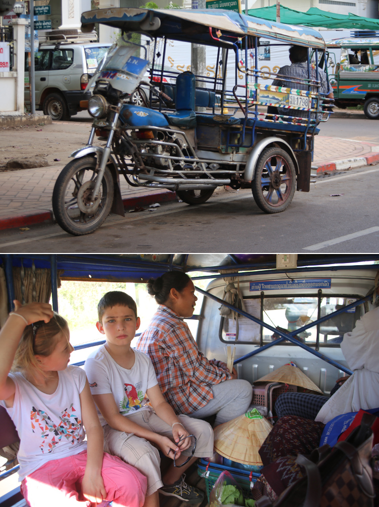 Ici, au Laos, à part le sleeping bus, nous nous déplaçons surtout en tuktuk collectif ! Avec les locaux ...